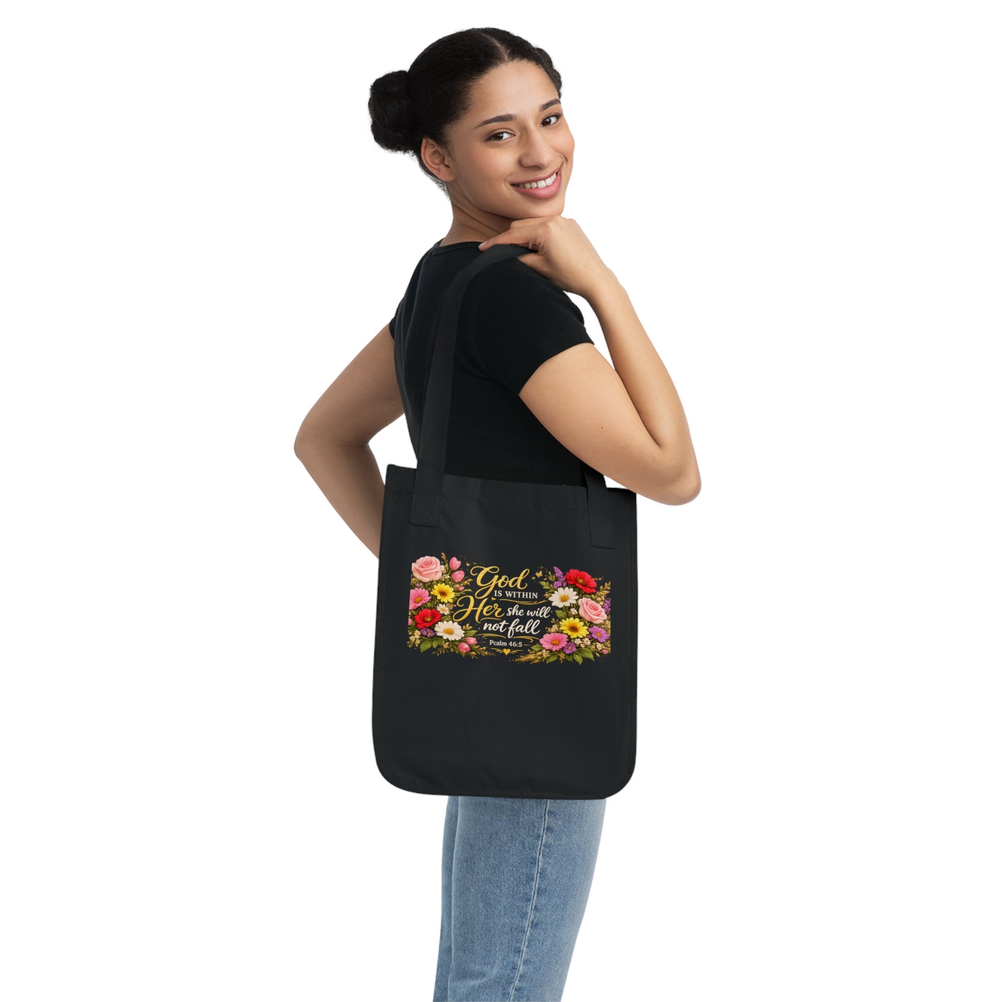 This beautiful Christian floral tote bag features the inspiring Bible verse “God is within her, she will not fall – Psalm 46:5.” The elegant gold lettering surrounded by colorful flowers creates a meaningful and uplifting design that reminds you of God's strength and presence every day.